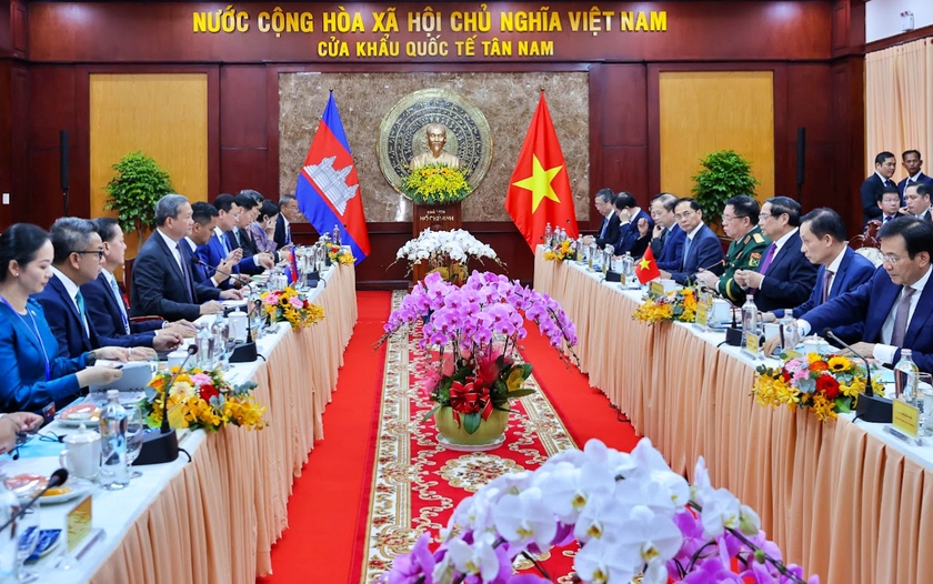 Đồng chủ trì Lễ khai trương Cửa khẩu quốc tế Tân Nam (tỉnh Tây Ninh) - Meun Chey (tỉnh Prey Veng) ngày 8/12, Thủ tướng Chính phủ Phạm Minh Chính và Thủ tướng Hun Manet đã có cuộc hội đàm trao đổi các biện pháp thúc đẩy quan hệ song phương Việt Nam - Campuchia thời gian tới.