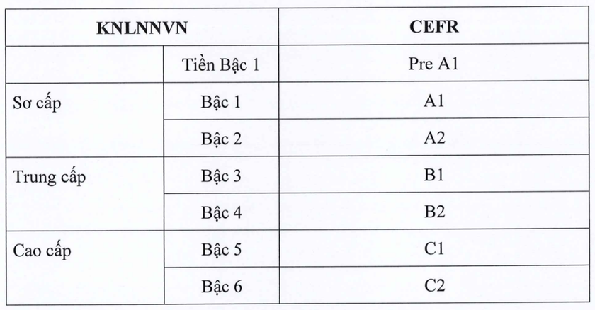 Khung năng lực ngoại ngữ dùng cho Việt Nam được chia làm 3 cấp (sơ cấp, trung cấp và cao cấp). Cụ thể như sau: