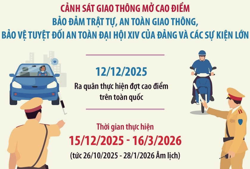Thực hiện chỉ đạo của Bộ trưởng Bộ Công an về mở đợt cao điểm tấn công, trấn áp tội phạm, Cục Cảnh sát giao thông vừa ban hành Kế hoạch cao điểm bảo đảm trật tự, an toàn giao thông góp phần bảo vệ tuyệt đối an ninh, an toàn Đại hội đại biểu toàn quốc lần thứ XIV của Đảng; bầu cử đại biểu Quốc hội khóa XVI, HĐND các cấp nhiệm kỳ 2026-2031; Tết Dương lịch, Tết Nguyên đán Bính Ngọ; các sự kiện lớn của đất nước và các lễ hội đầu năm 2026.
