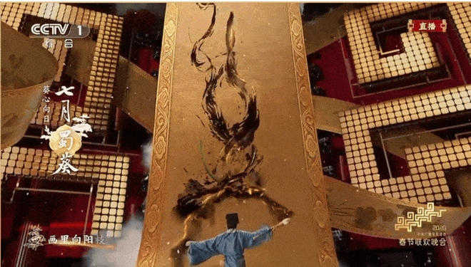 Nhờ đó, sân khấu có thể “biến hình” liên tục: từ mặt nước, mặt băng cho tới bức tranh thủy mặc khổng lồ. Không gian biểu diễn không còn giới hạn bởi cấu trúc vật lý mà được mở rộng thành một “canvas kỹ thuật số” động, nơi nghệ sĩ tương tác trực tiếp với môi trường hình ảnh.