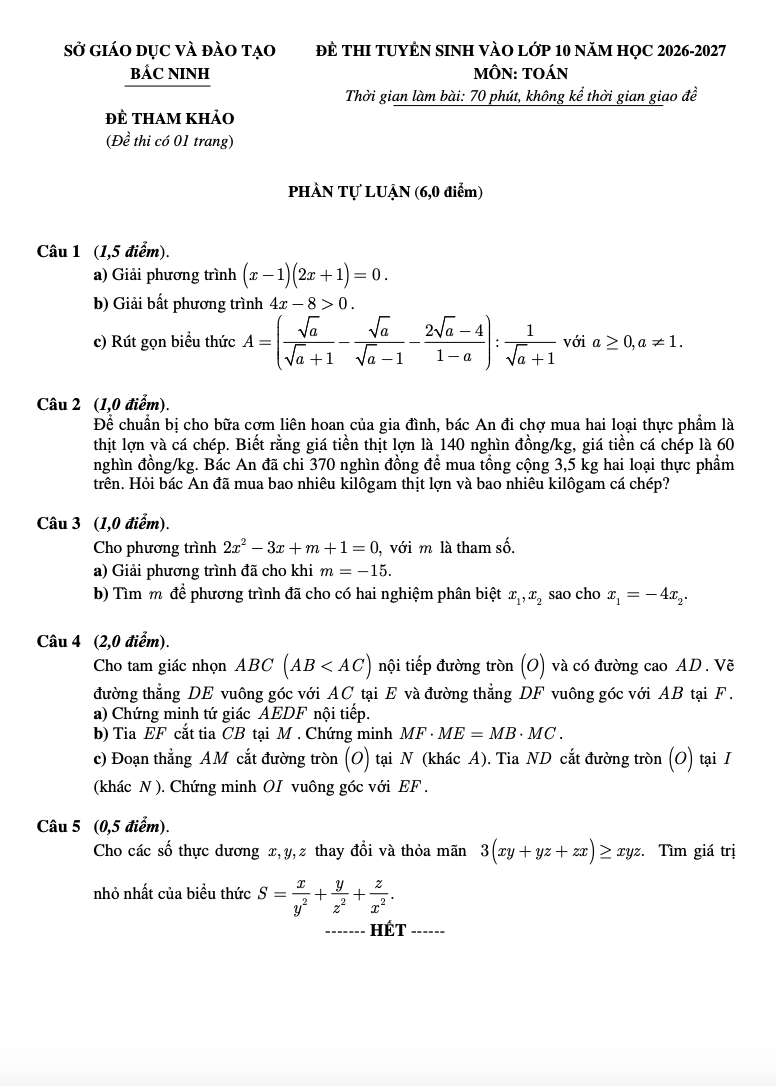 Đề thi thử vào lớp 10 môn Toán của Sở Giáo dục và Đào tạo Bắc Ninh năm học 2026-2027 như sau: