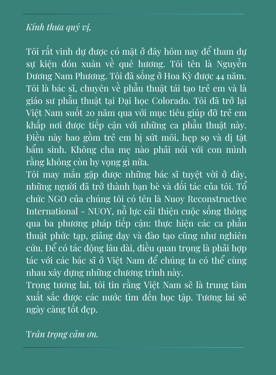 Giáo sư Phương Nguyễn: Tôi hy vọng mọi người ở khắp nơi có thể đồng hành cùng với chúng tôi và NOUY, nếu là chuyên gia, hãy tham gia với chúng tôi trong vai trò là bác sĩ phẫu thuật; nếu là một người có tấm lòng giúp đỡ người khác, hãy ủng hộ NOUY bằng tài lực, vật lực để NOUY có thể vận hành và phát triển hơn nữa.