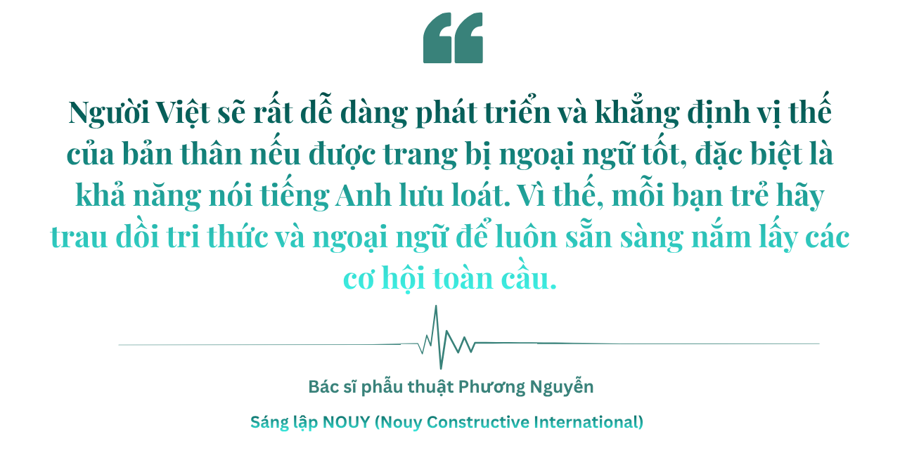 Người Việt Nam ở bất cứ đâu cũng rất chăm chỉ và giỏi chuyên môn, tôi tin rằng, người Việt sẽ rất dễ dàng phát triển và khẳng định vị thế của bản thân nếu được trang bị ngoại ngữ tốt, đặc biệt là khả năng nói tiếng Anh lưu loát. Vì thế, mỗi bạn trẻ hãy trau dồi tri thức và ngoại ngữ để luôn sẵn sàng nắm lấy các cơ hội toàn cầu.