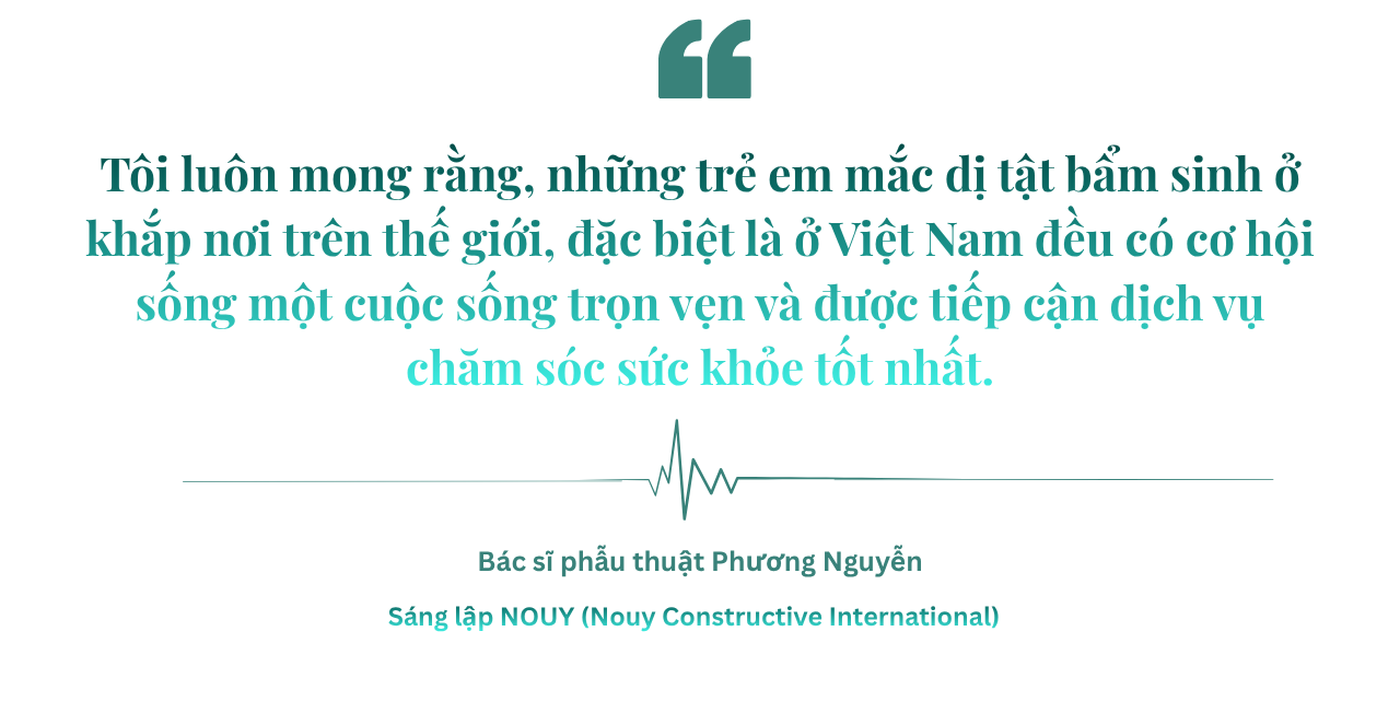 Do đó, tôi cố gắng nỗ lực, cùng xây dựng và phát triển một tổ chức y tế thiện nguyện. NOUY không chỉ trao cho các em bé cơ hội được phẫu thuật bởi các chuyên gia mà còn hỗ trợ về thiết bị y tế, dụng cụ phẫu thuật, đặc biệt, chúng tôi sẽ chuyển giao kỹ thuật, công nghệ và đào tạo bác sĩ tại Việt Nam để họ cũng có thể thực hiện được các ca phẫu thuật khó, có thể cứu giúp bệnh nhi bất cứ lúc nào mà không cần sự có mặt của chúng tôi.
