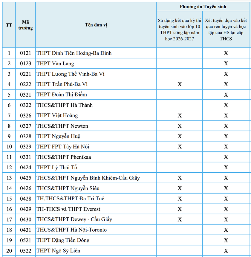 Theo thông báo của Sở Giáo dục và Đào tạo Hà Nội, phương án tuyển sinh của các trường trung học phổ thông chất lượng cao và trường trung học phổ thông tư thục gồm 2 phương thức chính: Sử dụng kết quả kỳ thi tuyển sinh vào lớp 10 trung học phổ thông công lập năm học 2026-2027; Xét tuyển dựa vào kết quả rèn luyện và học tập của học sinh tại cấp trung học cơ sở (học bạ).