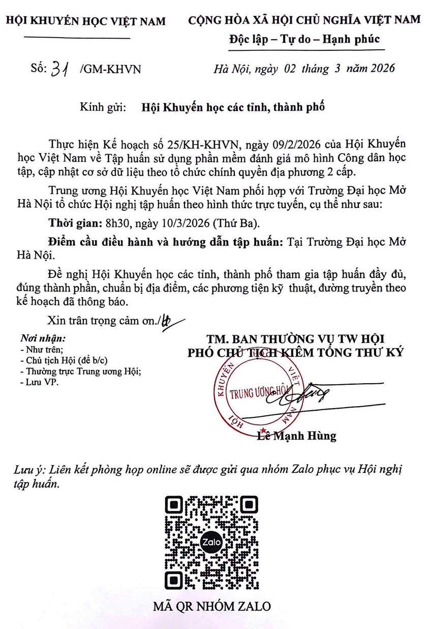 Hệ thống hội khuyến học Việt Nam lưu ý Hội nghị tập huấn đánh giá mô hình Công dân học tập sẽ kết nối qua nhóm Zalo, hình thức tập huấn online, điều hành tập huấn do Trường Đại học Mở Hà Nội, thời gian 8 giờ 30 phút ngày 10/3/2026.