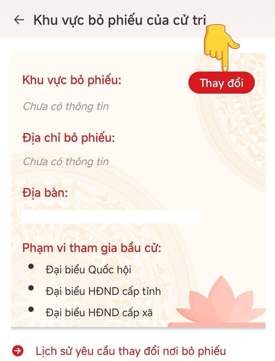 Bước 3: Xem thông tin về địa điểm khu vực bỏ phiếu và đơn vị bầu cử được hiển thị dựa trên cơ sở dữ liệu dân cư.