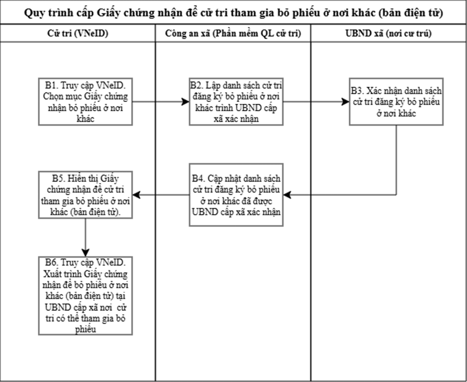 Trước hết, cử tri đăng nhập ứng dụng VNeID, lựa chọn mục "Giấy chứng nhận bỏ phiếu ở nơi khác" trong phần bầu cử và đăng ký địa điểm mong muốn tham gia bỏ phiếu. Sau khi hoàn tất thao tác, yêu cầu của cử tri sẽ được hệ thống tự động chuyển đến phần mềm quản lý cử tri.