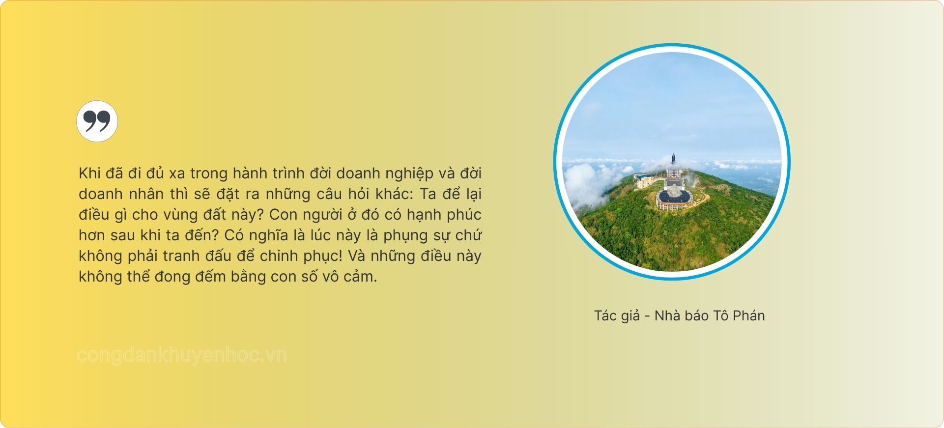 Doanh nghiệp/doanh nhân văn hóa không phải là doanh nghiệp/doanh nhân không mưu cầu lợi nhuận, mà thừa nhận lợi nhuận là điều kiện tồn tại. Nhưng tính văn hóa của doanh nghiệp/doanh nhân là ý thức lợi nhuận không phải là thước đo duy nhất của thành công. Mỗi quyết định kinh doanh đều mang theo hệ quả văn hóa: nó tạo ra không gian sống, định hình thói quen, ảnh hưởng đến cách con người nhìn nhận về cái đẹp, về giá trị con người nói chung, về giá trị đồng tiền, về giá trị của chính doanh nghiệp và chính ông chủ của doanh nghiệp đó. Tôi tin rằng những người đứng đầu Hội đồng sáng lập Sun Group cũng như Hội đồng Quản trị Sun Group quá hiểu điều đó!