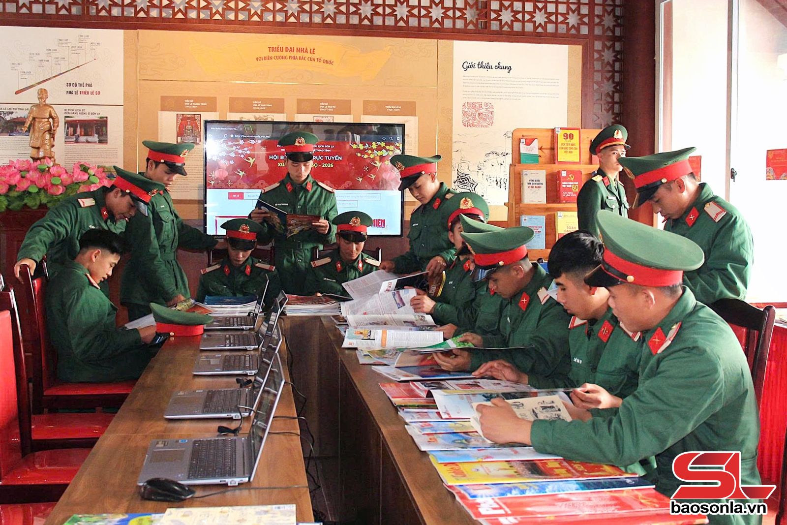 Cán bộ chiến sĩ Bộ Chỉ huy quân sự tỉnh Sơn La đọc các ấn phẩm báo chí tại Hội báo xuân tỉnh Sơn La năm 2026.
