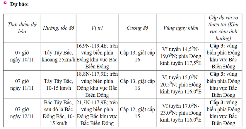 Từ ngày 10 đến 12/11, vùng biển phía Đông Bắc Biển Đông nhiều khả năng chịu ảnh hưởng trực tiếp của gió bão mạnh cấp 11-13, giật cấp 16, sóng cao 8-10 m.