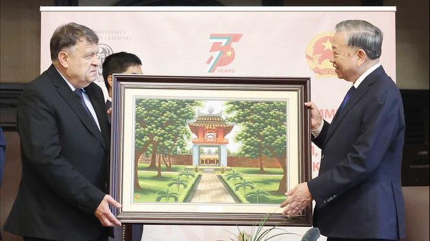 Tổng Bí thư Tô Lâm tặng Hiệu trưởng Trường Đại học Sofia Georgi Valchev bức tranh lưu niệm. Ảnh: TTXVN