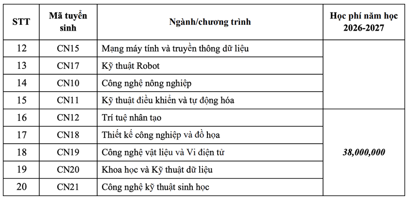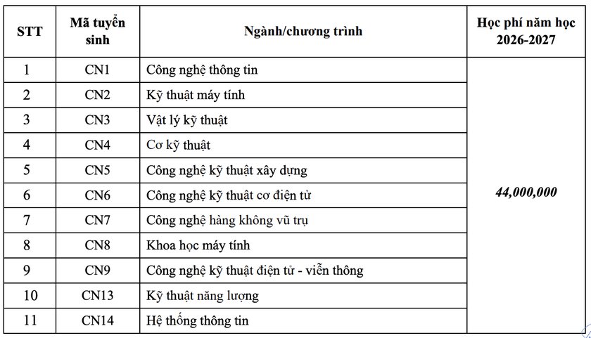 Theo thông tin tuyển sinh của Trường Đại học Công nghệ, Đại học Quốc gia Hà Nội, học phí năm học 2026-2027 của trường dao động từ 38-44 triệu đồng/năm học. So với năm ngoái, học phí tăng 4 triệu đồng.